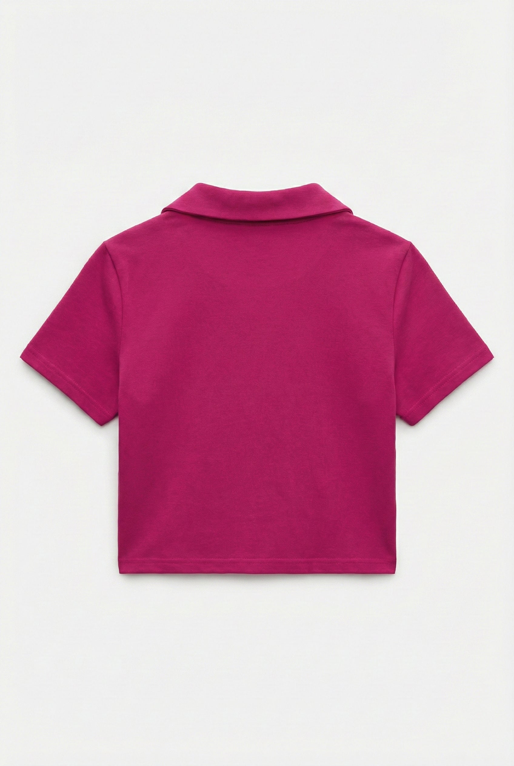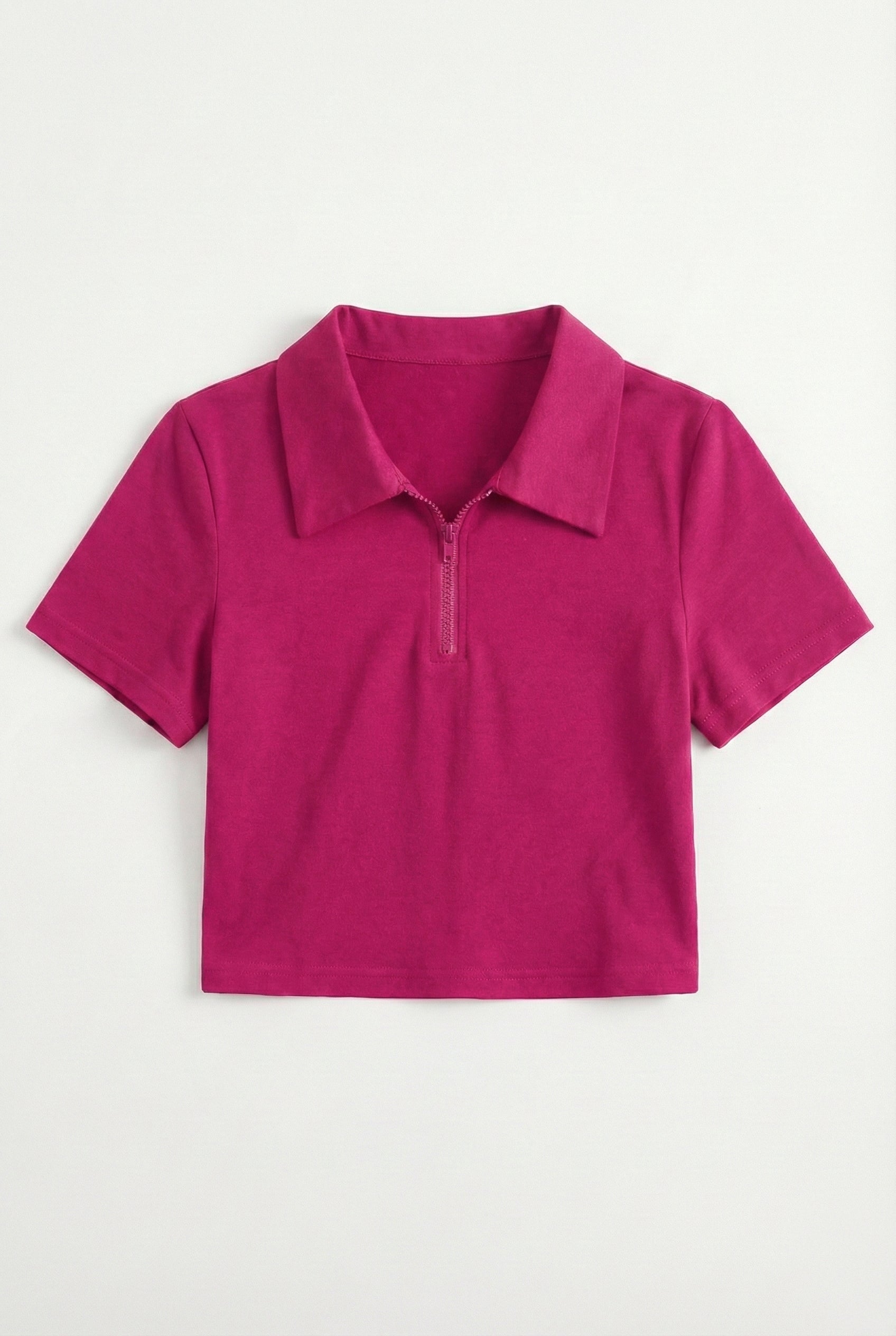 Cropped polo-style top with a structured collar and short sleeves, featuring a front zip closure for a modern, streamlined look. Designed in a solid colour with a clean, minimal finish.