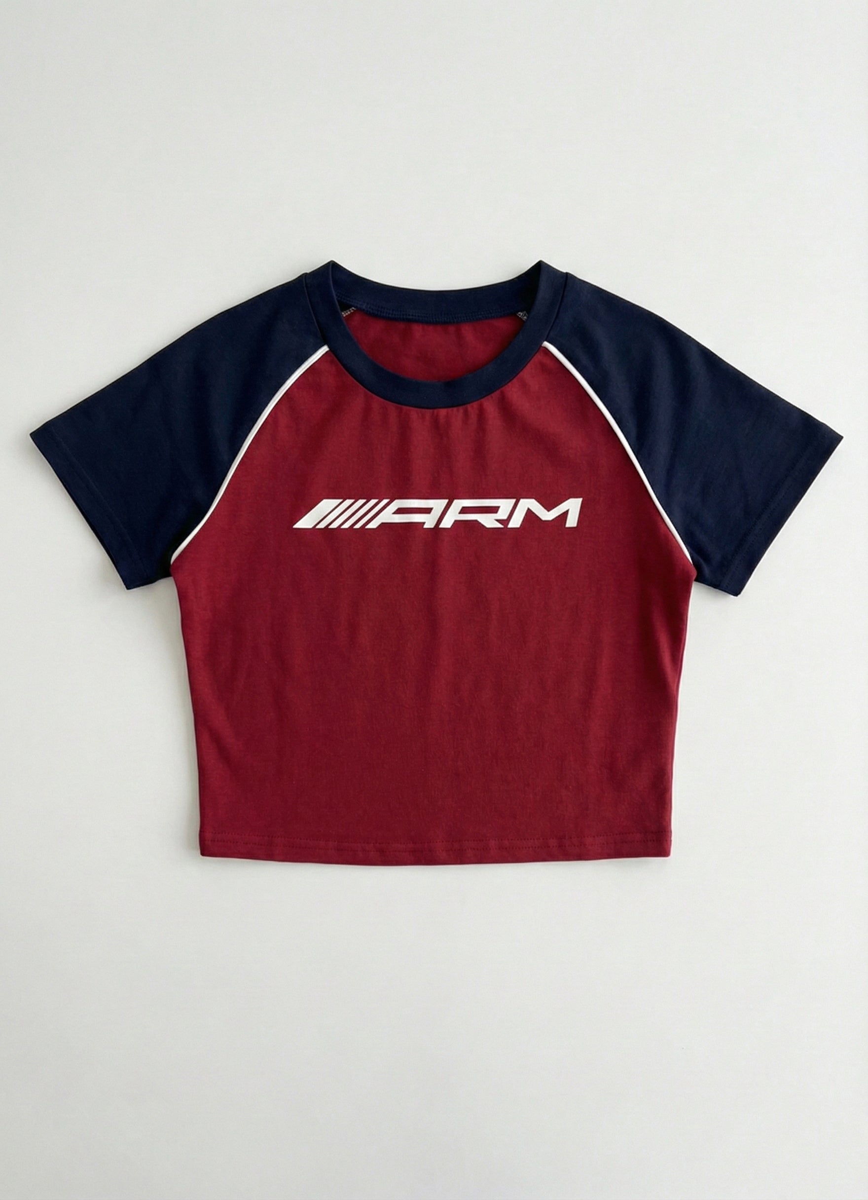 Cropped sporty T-shirt with a fitted silhouette and contrast panel detailing. Designed with a round neckline and short sleeves, finished with a bold typographic chest print for an athletic, street-inspired look.